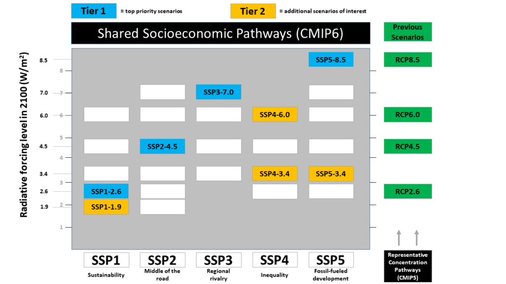 Figure 1. Shared Socio-economic Pathways and year 2100 radiative forcing combinations used in ScenarioMIP (Source: https://climate-scenarios.canada.ca/?page=cmip6-overview-notes).